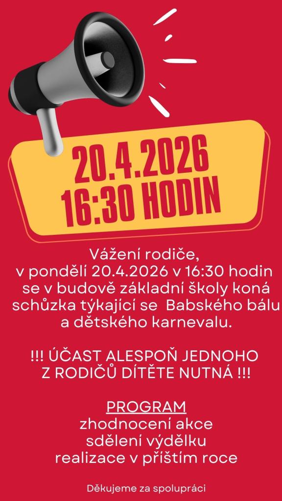 Vážení rodiče, v pondělí 20.4.2026 v 16:30 hodin se v budově základní školy koná schůzka týkající se Babského bálu a dětského karnevalu. !!! ÚČAST ALESPOŇ JEDNOHO Z RODIČŮ DÍTĚTE NUTNÁ !!! PROGRAM zhodnocení akce sdělení výdělku realizace v příštím roce Děkujeme za spolupráci